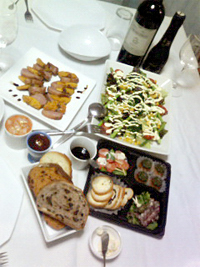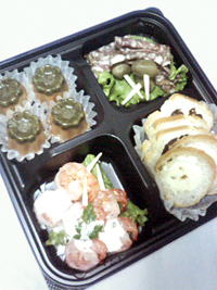 サーモン専門のお店でデリセット(サーモンは無いw)を購入。ケースのままサーブ(笑)ミニゼリー型のは緑部分がバジル、オレンジ部分がパプリカ、中にもパプリカのピュレが。ちっさいのんい手ぇ込んでるわ〜。サラミ、海老のカクテル、フランスパンにオレンジクリチとレーズンバターが入ったもの。