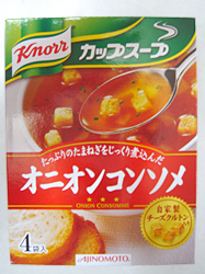 オニオンコンソメ クノール/味の素 2007年12月30日 1箱(4袋入り)1食41kcal たっぷりのたまねぎを丁寧に煮込んで、たまねぎ本来の自然な甘みとうまみを引き出したオニオンコンソメです。野菜を煮出したブイヨンとビーフエキスが織りなす深いコクと上品な味わいをお楽しみください。 自家製チーズクルトン入り コンソメ味が濃いぃ〜塩っぱさは程よい。 小粒クルトンはサクサク、ちょっと普通より香ばしい?のはチーズクルトンだから?ふんふん、なかなか美味い。 けどスープはやっぱポタージュまったり濃厚系が好きや〜。 ☆味の素HP ☆クノール公式HP あなたの1Clickがプァワーの源です♪ 「├レトルト・インスタント食品」カテゴリの最新記事 タグ :#味の素#クノール#スープ#インスタント食品 < 前の記事次の記事 > コメント コメントフォーム 名前 コメント 記事の評価 リセット リセット 顔 星 情報を記憶 コメントを投稿する トラックバック