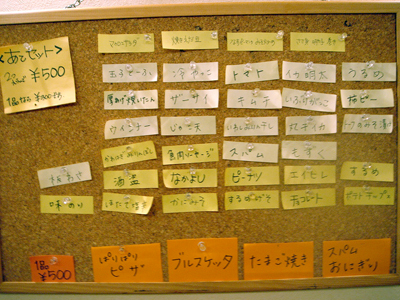 コルクボードにお酒のアテによさげな簡単なフードメニューが。