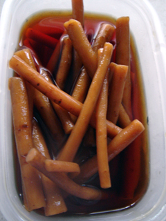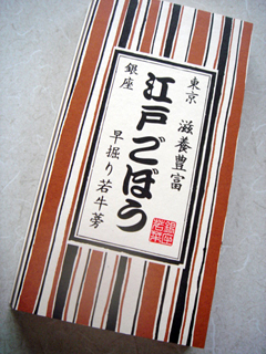 江戸ごぼう 銀座若菜 2008年08月26日 1箱(90g×2P)¥1100 早堀りごぼうの先端の細い部分だけを皮の風味を残して、香ばしい醤油味に漬け込みました。 こちらも頂き物〜。細いごぼうのしょうゆ漬け。 家でも常備菜によく作るけどさすが、銀座? 細く、形や長さの整った美しすビジュアル。美しすごぼう。 しゃきしゃき食感にお上品な味付け。 ご飯のお供に。というより冷酒でキュッと頂きたい感じだわ〜 結局、お酒のアテに(笑) ☆銀座若菜HP あなたの1Clickがプァワーの源です♪ 「├酒の肴・珍味系」カテゴリの最新記事 タグ :#ごぼう#銀座若菜 < 前の記事次の記事 > コメント コメントフォーム 名前 コメント 記事の評価 リセット リセット 顔 星 情報を記憶 コメントを投稿する トラックバック
