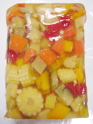 原材料:豚肉、ゼラチン、ズッキーニ、パプリカ、澱粉、人参、食塩、ヤングコーン、たまねぎ、香辛料、チキンビーフエキス、チキンファット、酵母エキス、野菜エキス、醤油、食用植物油、砂糖、‥