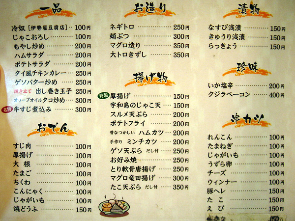 メニューは串かつメインに一品色々。お酒もアテも立ち飲み価格。