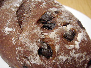 チョコ味のフランスパンに刻んだクルミを練り込んだ食事パンです。