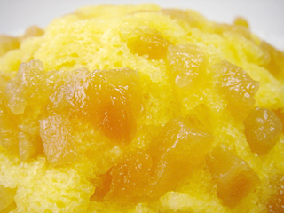 マンゴーパルプを入れた生地に、ドライマンゴーをトッピングして蒸し上げました。