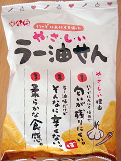 流行りのラー油を使用した、おせんべいです。柔らかく、やさしい味のラー油せんに仕上げておりますので、その3つの理由をパッケージに挙げています。