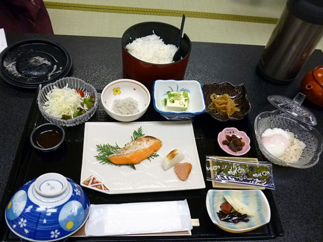 ご飯(おかわり可)、味噌汁、冷奴、きんぴらごぼう、サラダ(淡路島玉ねぎドレッシング)、温泉卵入りそうめん、じゃこおろし、焼き鮭、かまぼこ、明太子、漬物、昆布佃煮