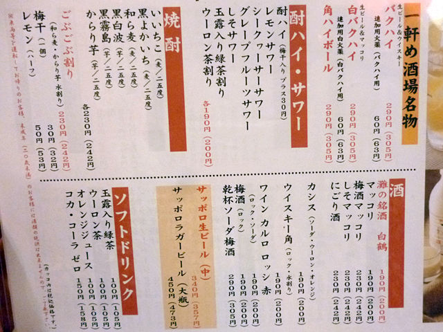 メニューはごく一般的居酒屋メニュー。それほどバリエ豊富ではないけど、まぁ軽く飲むには充分。何せお安いですし♪付き出しも無し=チャージが無いのも嬉しい。ちょい飲みにまたオジャマします〜〜