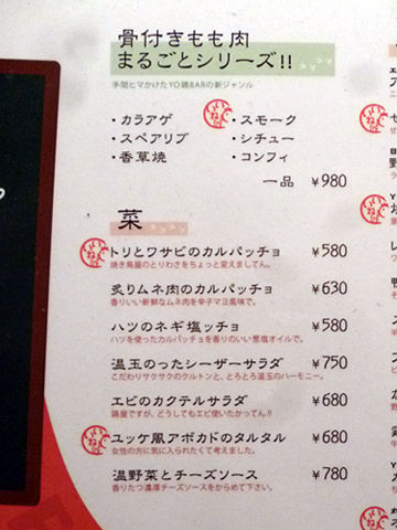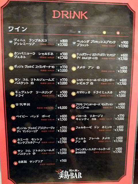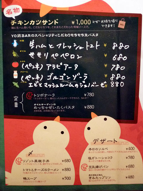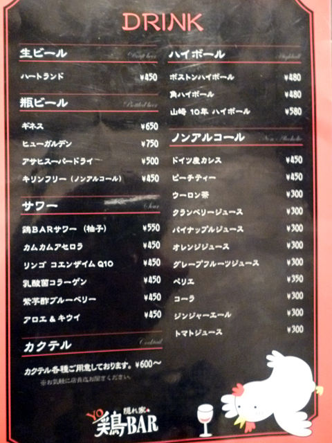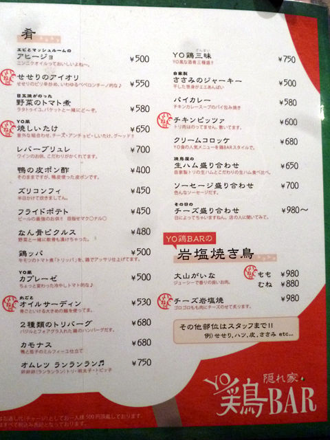 こちらのお店は、懐石で修行された方が和の「WA鶏BAR」をオープン、次いで今回オジャマした洋の「YO鶏BAR」、そして中華の「CHU鶏BAR」という和洋中の3店舗を展開されているんですって〜