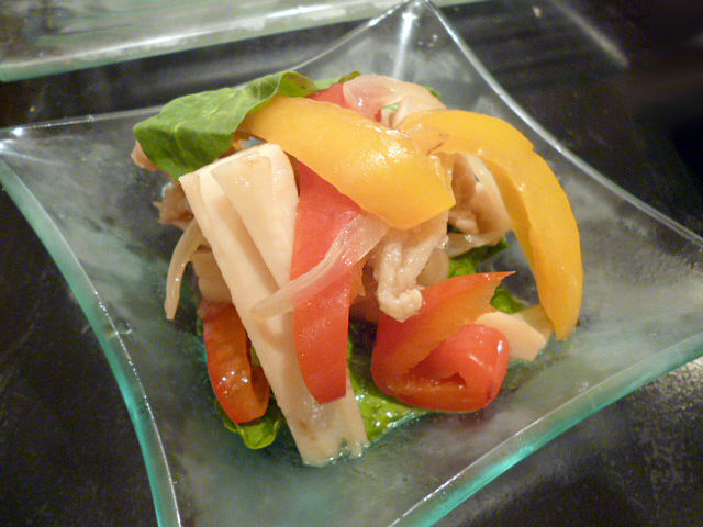 一見、生ハムのようなこちらも鶏肉!茎わさびのシャキショリッと爽やかな辛みが、あっさりササミの甘みを引き立ててくれます。