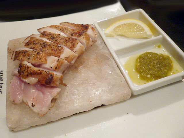 大山地鶏をヒマラヤ産のピンク岩塩の上で焼いて。