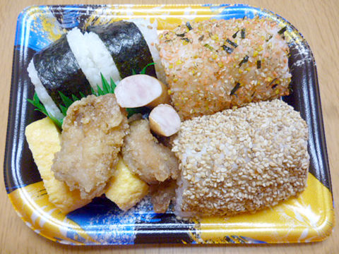 原材料:塩飯(米(国産)、植物油脂、食塩)、玉子焼、鶏唐揚、ウィンナー、さけふりかけ、白ごま、海苔、pH調整剤、調味料、リン酸塩、加工デンプン、着色料、酸化防止剤、発色剤、香料