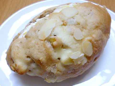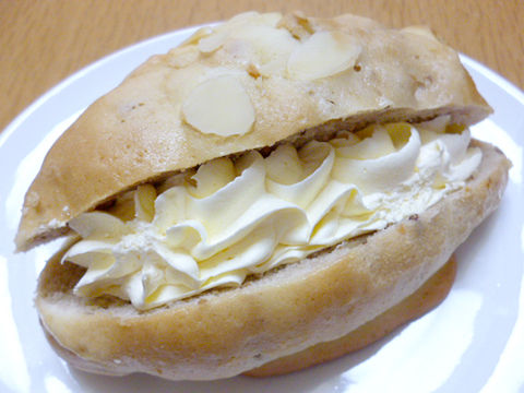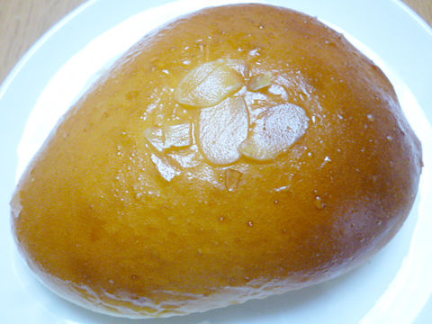 クリームパンの理想的フォルム!でツヤ皮ハリッと香ばしく中ふっくらふやんっ。ほの甘、スライスアーモンドが香ばしく生地だけでもンマッ