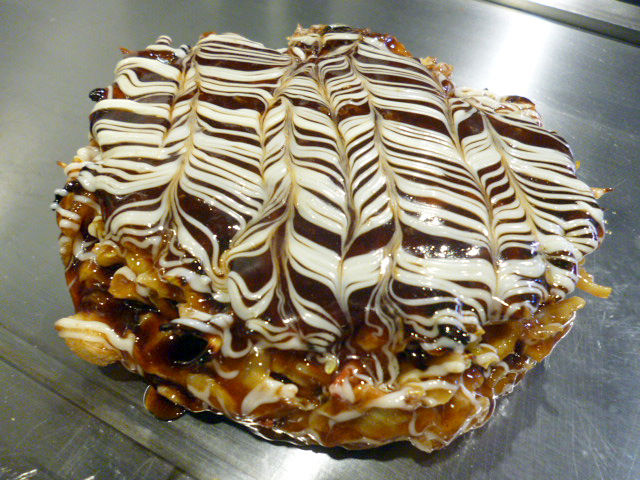 で、焼いて鉄板にできたオコゲを乗せて!これ、酒の肴にサイコーです!!