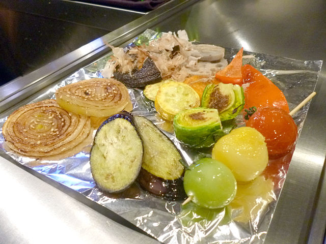 タマネギ、ナス、蓮根、特大シイタケ、ズッキーニ、パプリカ、カボチャ、芽キャベツ、プチトマト串焼き