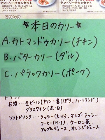 この日のカレーは以下の3種で、うちBとCをお願いしました。。