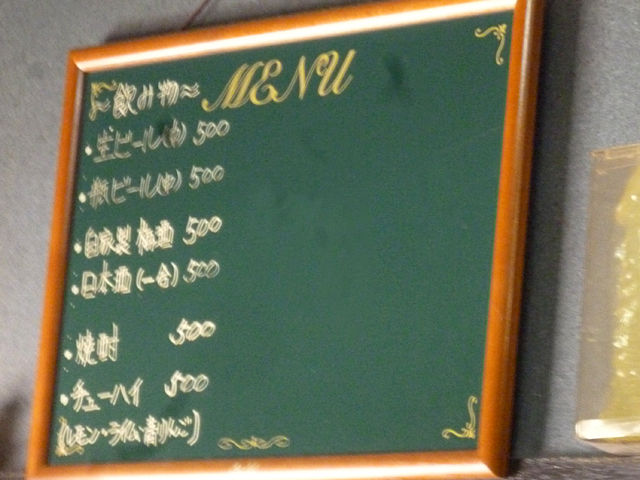 生中、中瓶、梅酒、日本酒、焼酎、チューハイ(レモン、ライム、青りんご)各¥500