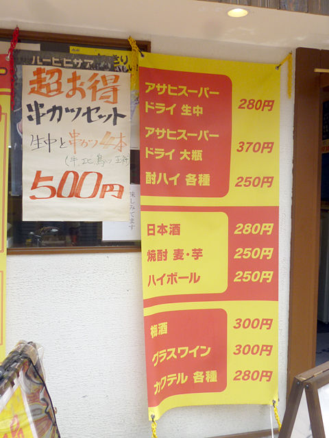 生中+串カツ4本(その他、生中+鳥の唐揚セット¥500もアリ)
