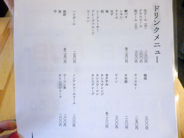 ドリンクは生中¥280、グラスビール¥200、大瓶¥370、酎ハイ・ハイボール・焼酎・ウイスキー各¥250、ワイン・ハイボール各¥300など