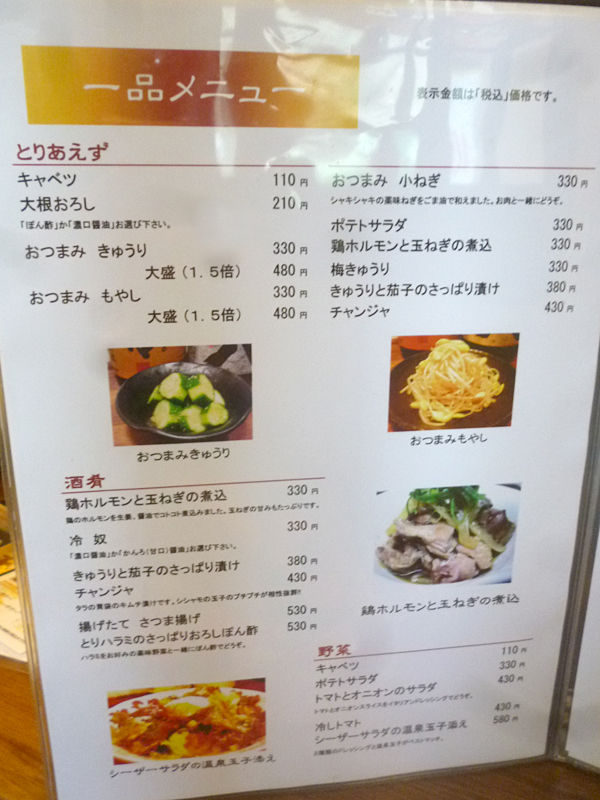 メインの焼き物は、鶏肉各部位、鶏ホルモン、野菜、各種盛合せの3ジャンルに、豚肉、野菜串、その他。お好みで薬味も。
