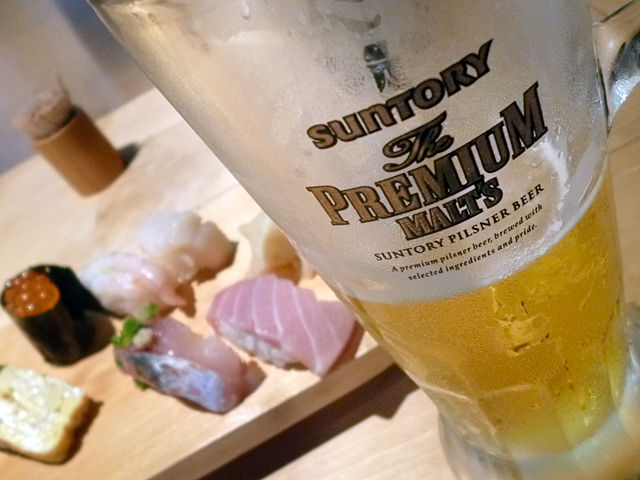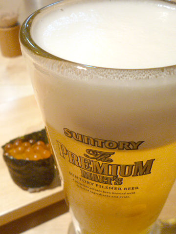 お寿司屋さんでは瓶ビールなイメージなのだけど、グラスに注がれたプレミアムモルツ、コレは妙にピタリ!なんか贅沢してる〜って気分♪