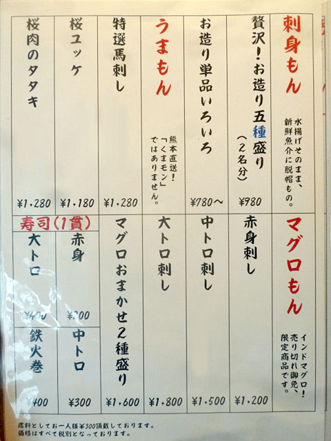 その他、お造り単品、盛り合せ、みんな大好きマグロもん各種、焼き揚げもん、肴、馬もん…など、お寿司+一品が揃います。