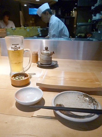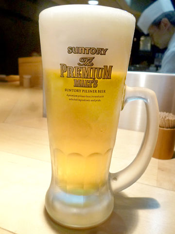 板さんの握る姿を肴にプレモルをグビグビッ。