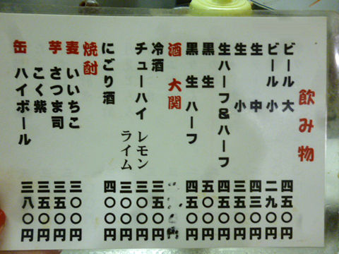 ドリンクは、大瓶¥450、小瓶¥290、生中¥430、生小¥350、ハーフ&ハーフ¥450、黒生¥500、黒生ハーフ¥450、冷酒¥350、にごり酒¥400、チューハイ各¥300、焼酎各¥300〜など。