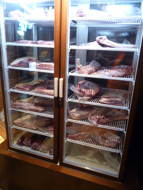 入り口すぐにはワインセラーと、目を惹くお肉がズラリ!