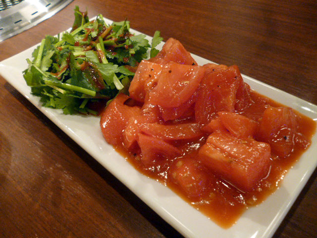 焼肉には必須のキムチ。変化球でトマトと香菜!