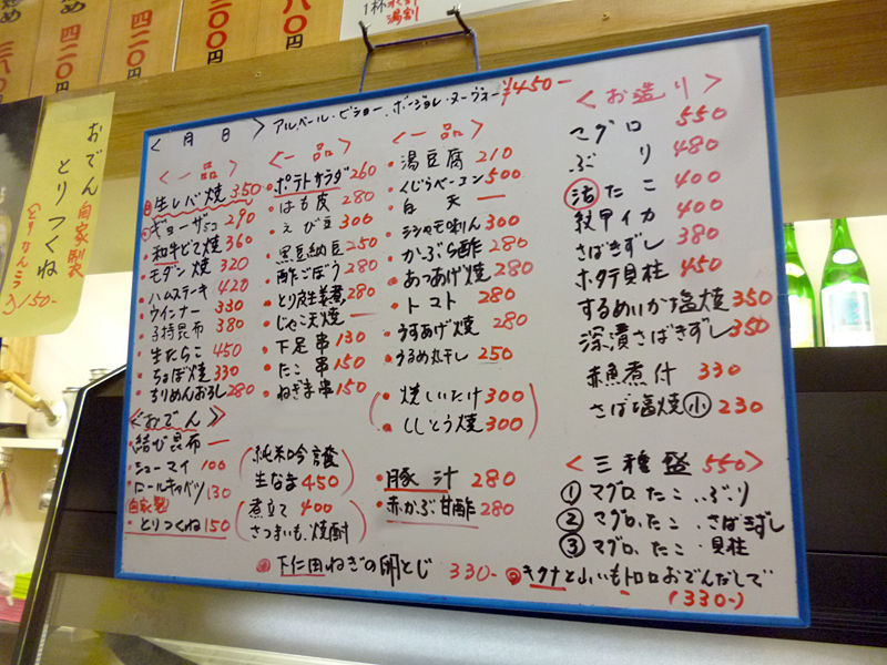 アテはパウチにおでん、一品、鉄板焼き、串焼きなどの通常メニュー。