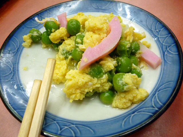 アテの入ったショーケースから豆の卵とじもろて。