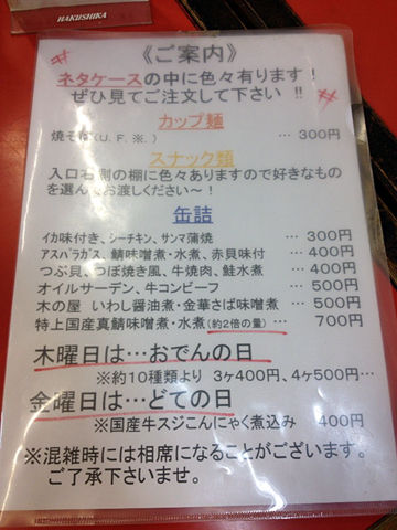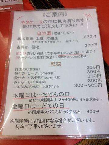 アテは先述通り、乾きもん、スナック、缶詰などの簡単なものの他、ネタケースがありそこに一品が色々揃います。そして、木曜日はおでんの日、金曜日はどての日、なんですって。おもしろーい!