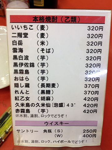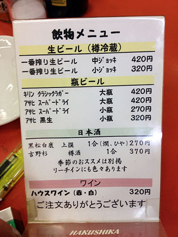 ドリンクは、生ビール中¥420、小¥320、大瓶各¥420、小瓶¥270、黒生¥320、日本酒、ワイン、ウイスキー、焼酎各種が揃います。