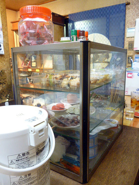 アテもシンプルながら乾きもん缶詰だけじゃなく、先述通り、おでんあり、湯どうふあり。ショーケースに並ぶ焼鳥、しゅうまい、たらこ、スパサラなどの一品あり。まぐろのお造りもあるんですね。鶴橋の市場で仕入れるのかなー?