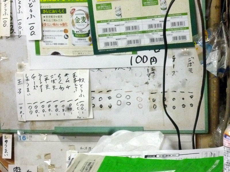 奴、玉子とうふ、きむち、ちくわ、ごぼ天、平天、ウインナー、チーズ、しゅうまい、玉子。以上が全て¥100。極めてシンプルですな!お、お鍋には湯豆腐もあるんですね。