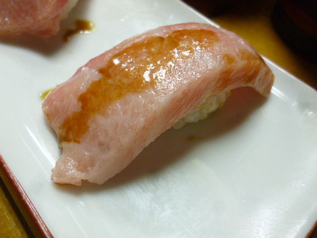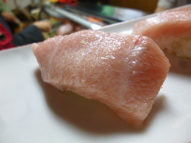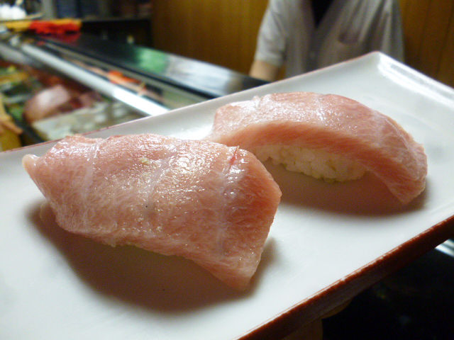 ケースを覗くとまぐろの美味しそうなこと!「今日のとろ、うまいで〜」の兄さんの一言が決め手になり、迷わず注文。