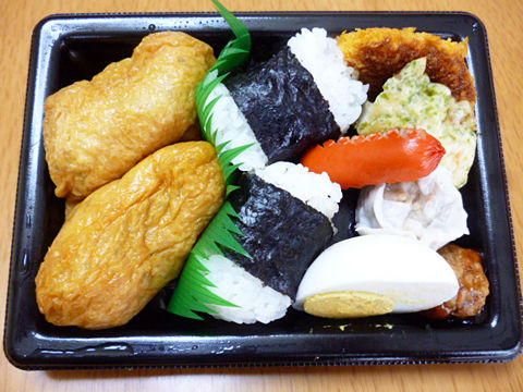 いなり寿司2個、俵おむすび2個におかずがついて通常の¥350でもなかなかエライ!けど、¥30引きはかなりお得ーっ