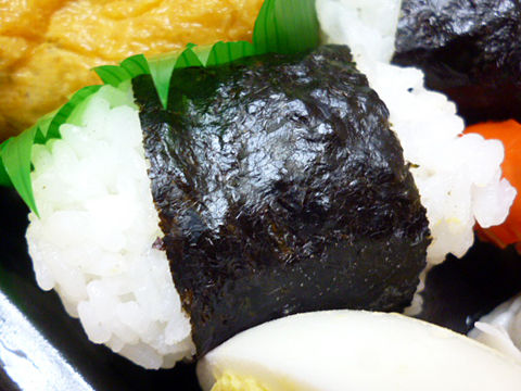 原材料:塩飯(国産米使用)、黒ごま入り酢飯(国産米使用)、味付油揚げ、ゆで卵、コロッケ、シュウマイ、肉団子、ちくわ磯辺天、ソーセージ、ソース、海苔、加工デンプン、pH調整剤、増粘剤、調味料、‥