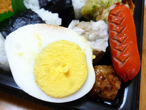 バラエティ豊かなおかずは、ゆで卵半分、切れ目入りの赤ウインナー、シュウマイ、肉団子、ちくわ天半分(立て割りのさらに半分)、コロッケ半分