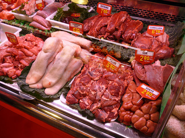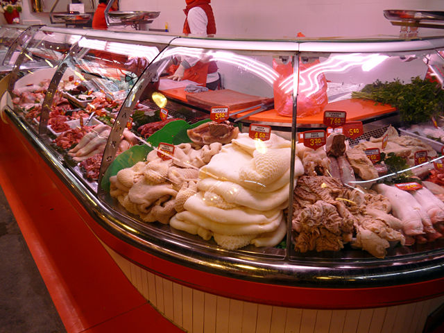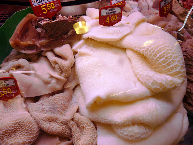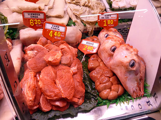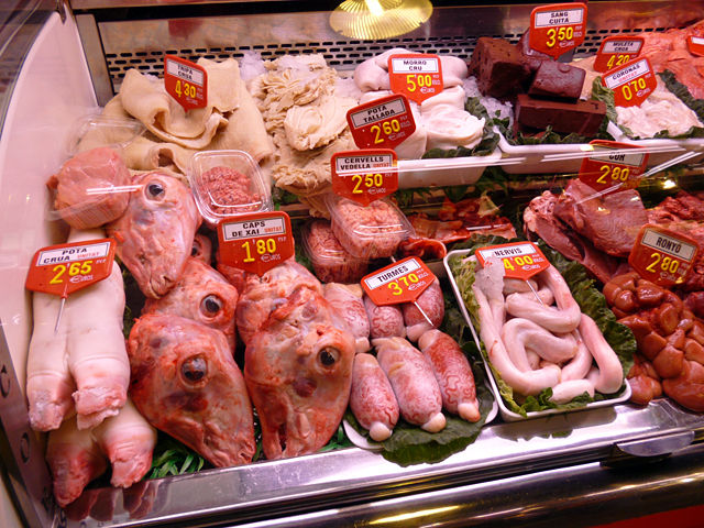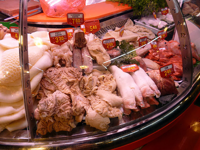 TRIPA BLANCA(白いトリッパ(ハチノス))やPOTA CRUA(豚足)、MORRO CRU(鼻筋)は分かるけど、CAPS DE XAI(ラムの頭)、TURMES(足首)、CERVELLS VEDELLA(子牛の脳)、SANG CUITA(血の塊)なんてのまであるよーっひょえーっっ!!でも食べてみたいなーっ(笑)