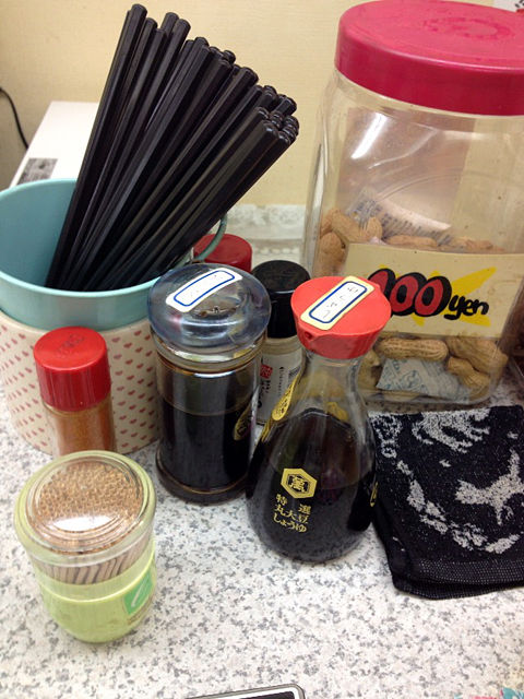 カウンターにはらっきょうやら豆もやしやらがミニ容器でスタンバイ。