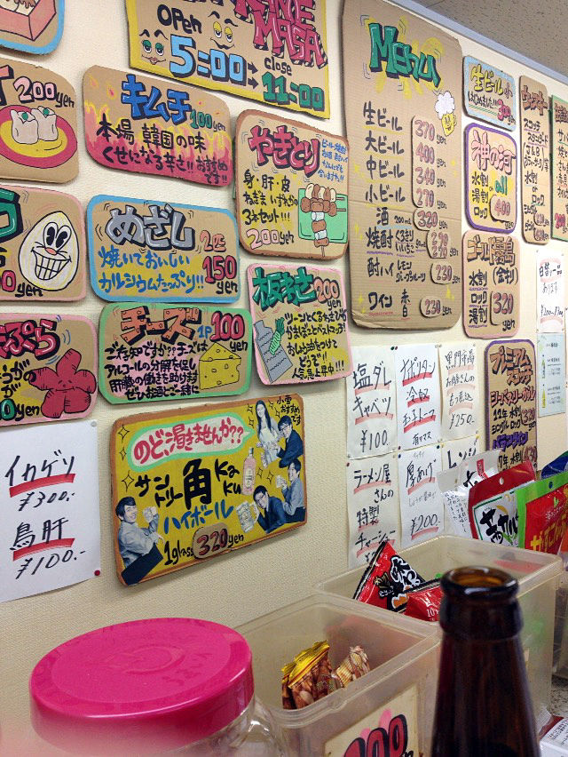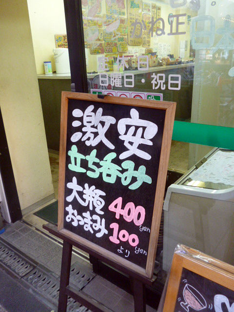 パッと見た外観はまんまコンビニ。ですが、入口付近には「立呑処」の暖簾あり、カラフルな看板、店前のボードなどなど、「立ち飲み屋です!」の宣伝バンバン(笑)