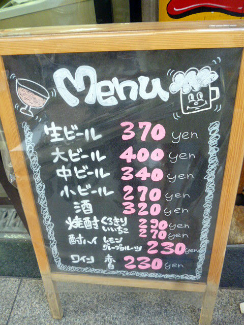 ドリンクは生ビール¥370、瓶ビール大¥400、中¥340、小¥270、酒、焼酎、酎ハイ、ワイン、ウイスキーなど一通り。