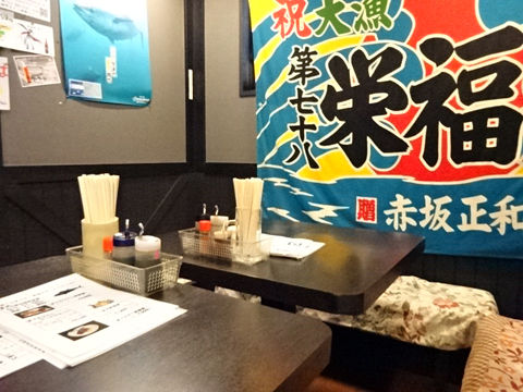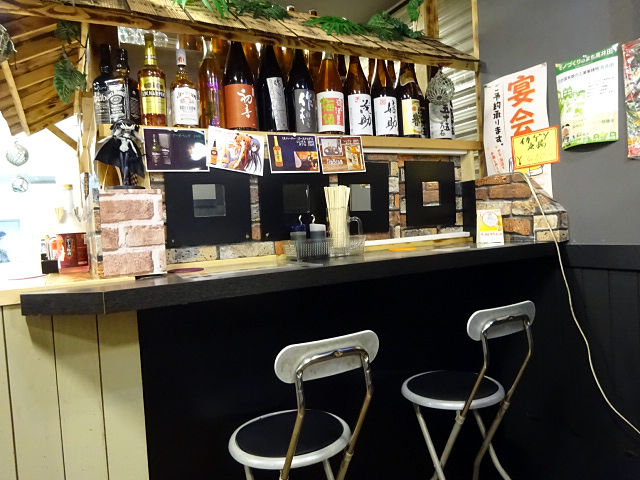 店内は思ったよりも広々〜っ。入口すぐ右手にテーブル席(半腰掛けタイプの立ち?)、その奥に座りのカウンター、左手に簡易バー風の立ちカウンター、奥に座れるテーブル席と、完全立ち飲みじゃないのね。