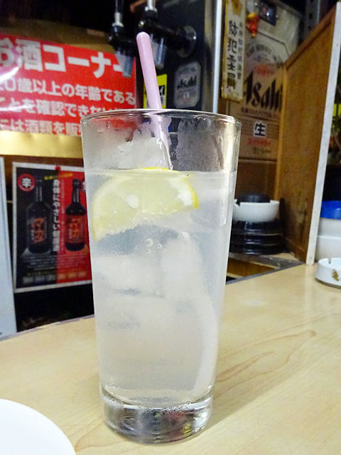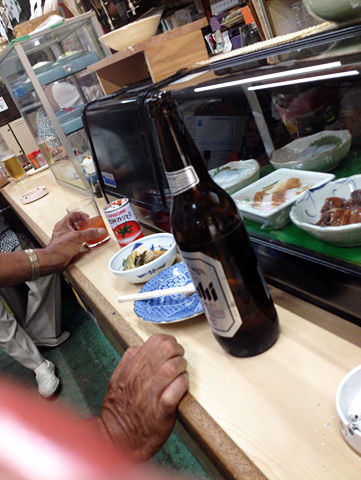 でもお隣さん、角打ちや大衆立ち飲みでは定番の(?)トマトジュースをチェイサーにビール飲んではります。品書き以外にもいろいろあるのかな?