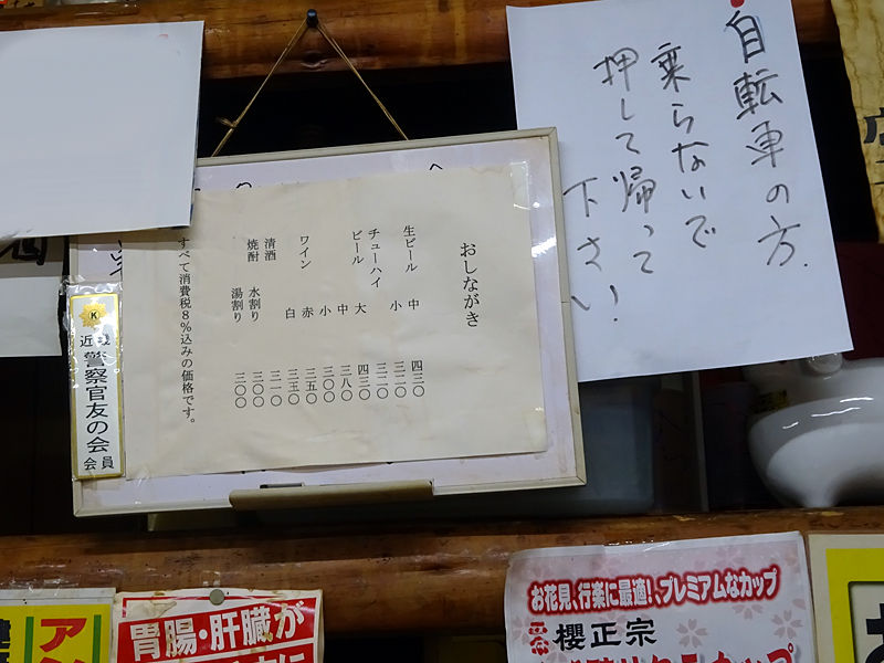 大瓶¥430、中瓶¥380、小瓶¥300、生中¥430、小¥320、チューハイ¥320、清酒¥310、焼酎¥300。ごくごくシンプルなラインナップ。