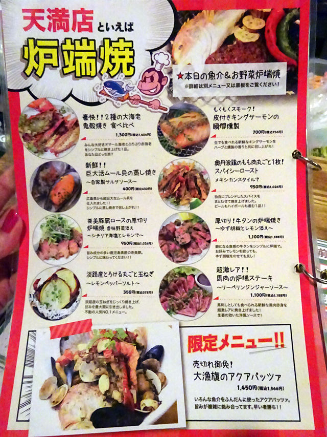 フードは、タパス、アラカルト、サラダ、ピザ、"天満店といえば"という炉端焼、パスタ、リゾットなど。