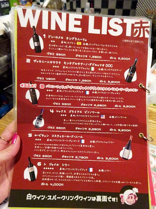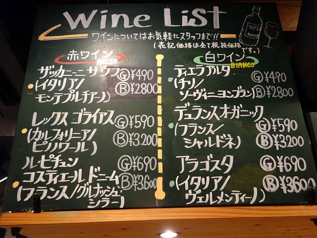 ワインもグラス¥390〜、デキャンタ¥1580、ボトル¥2200〜など数種。