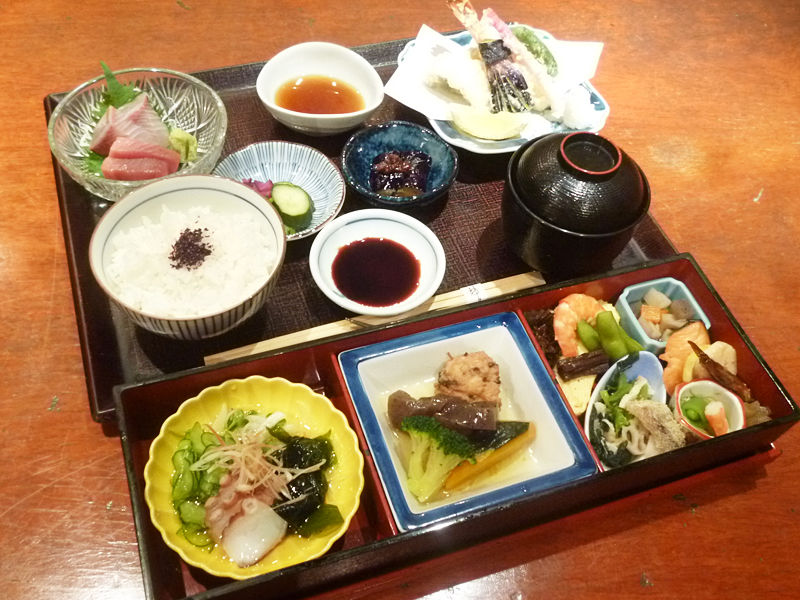 八寸、季節魚のおさしみ、炊き合わせ、焼きもの、天ぷら、ごはん、香の物、デザートの全8品