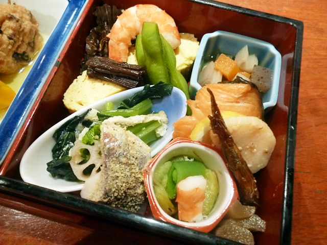 焼茄子、スナップエンドウ胡麻ポン酢、大豆旨煮、小松菜お浸し、若サギ甘露煮、キャラ蕗、塩鮭、帆立塩焼、出汁巻卵、海老芝煮、赤ずいき田舎煮、枝豆、酢レンコン…など